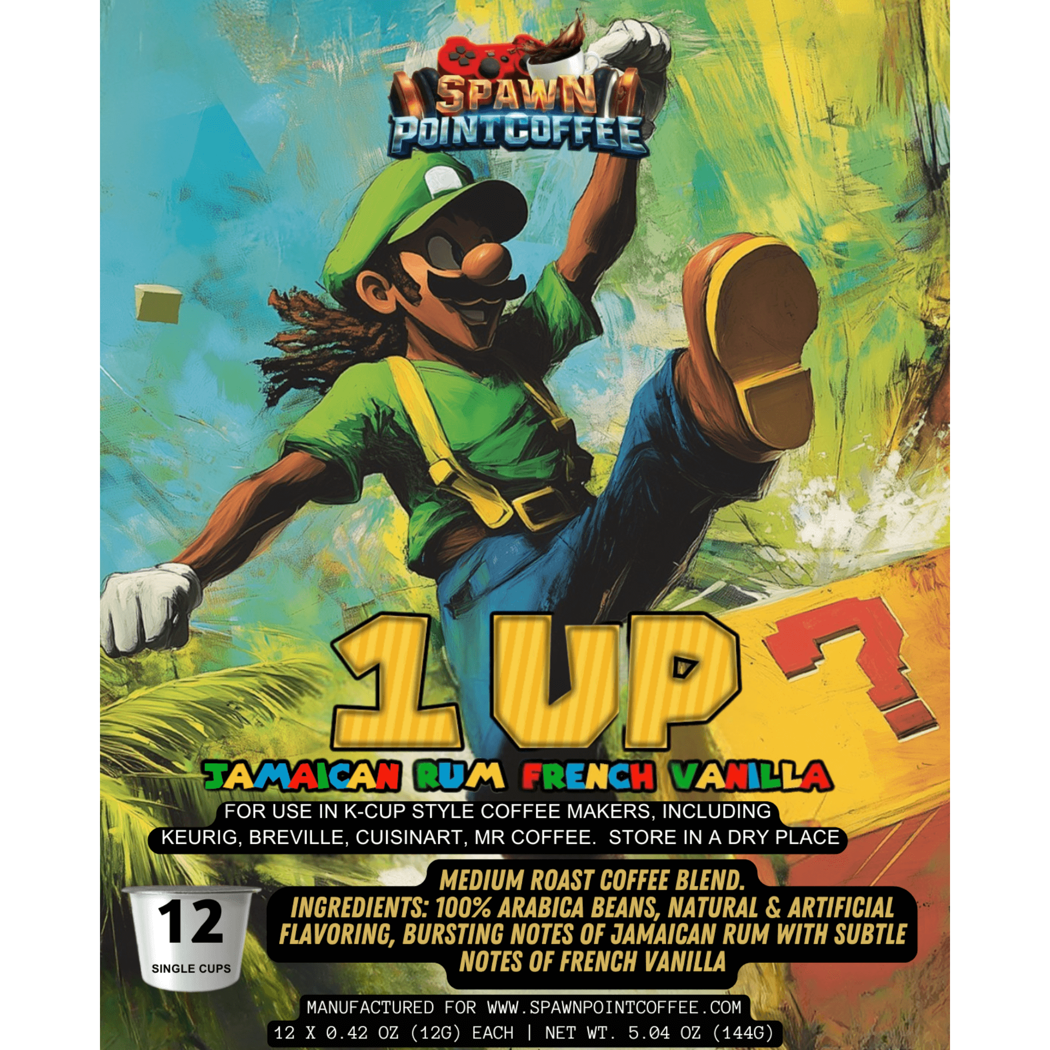 Imagine Luigi stepping off the plane in Jamaica, trading his green cap for a straw hat, and discovering the ultimate vacation power-up—a rich, aromatic coffee infused with bold Jamaican rum and sweet French vanilla. Now you can bring that island vibe straight to your gaming setup with 1 Up Jamaican Rum French Vanilla Coffee.
