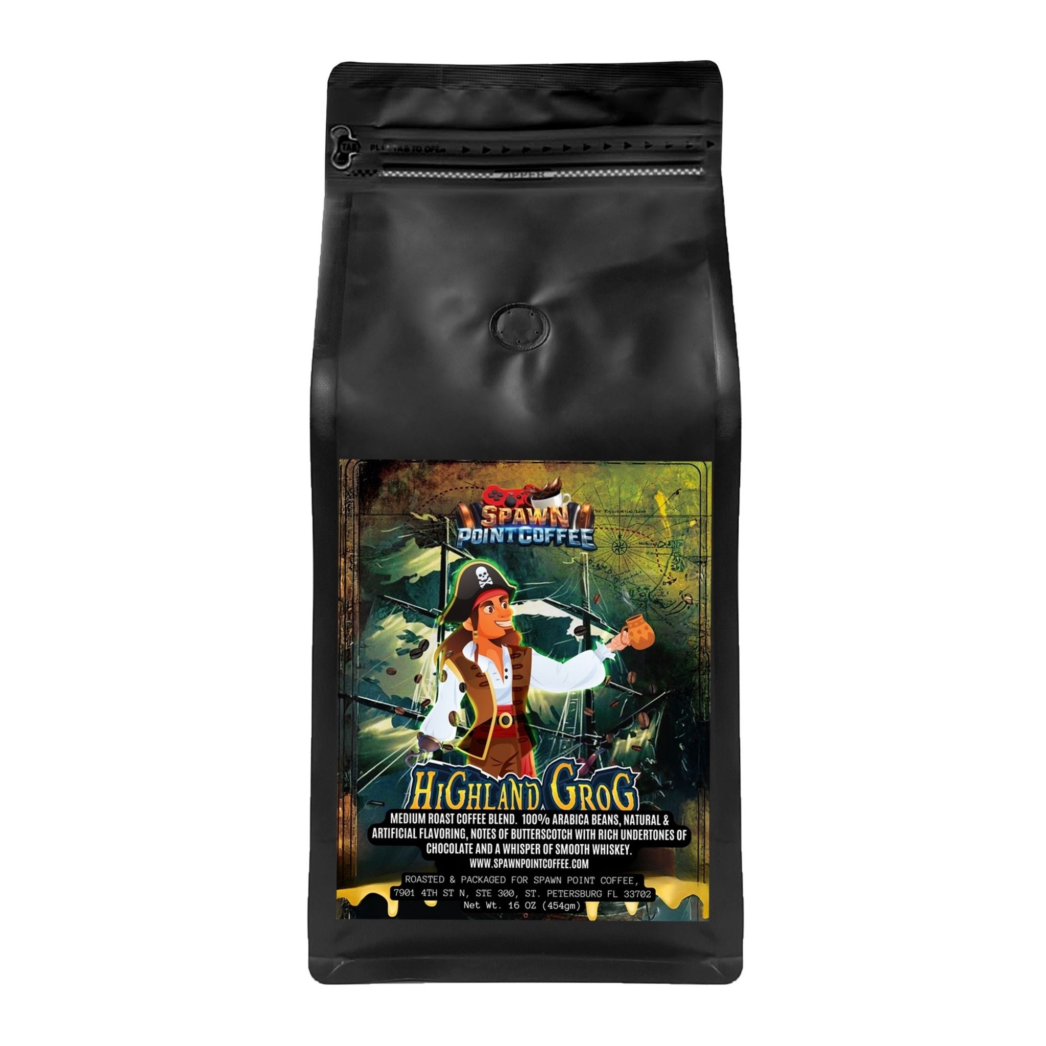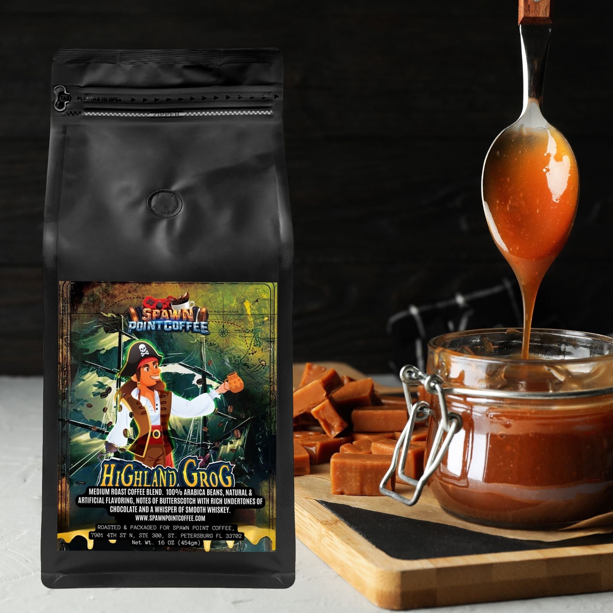 Highland Grog | Decaffeinated Medium Roast Butterscotch, Chocolate, & Whiskey Flavored Coffee | Whole Bean