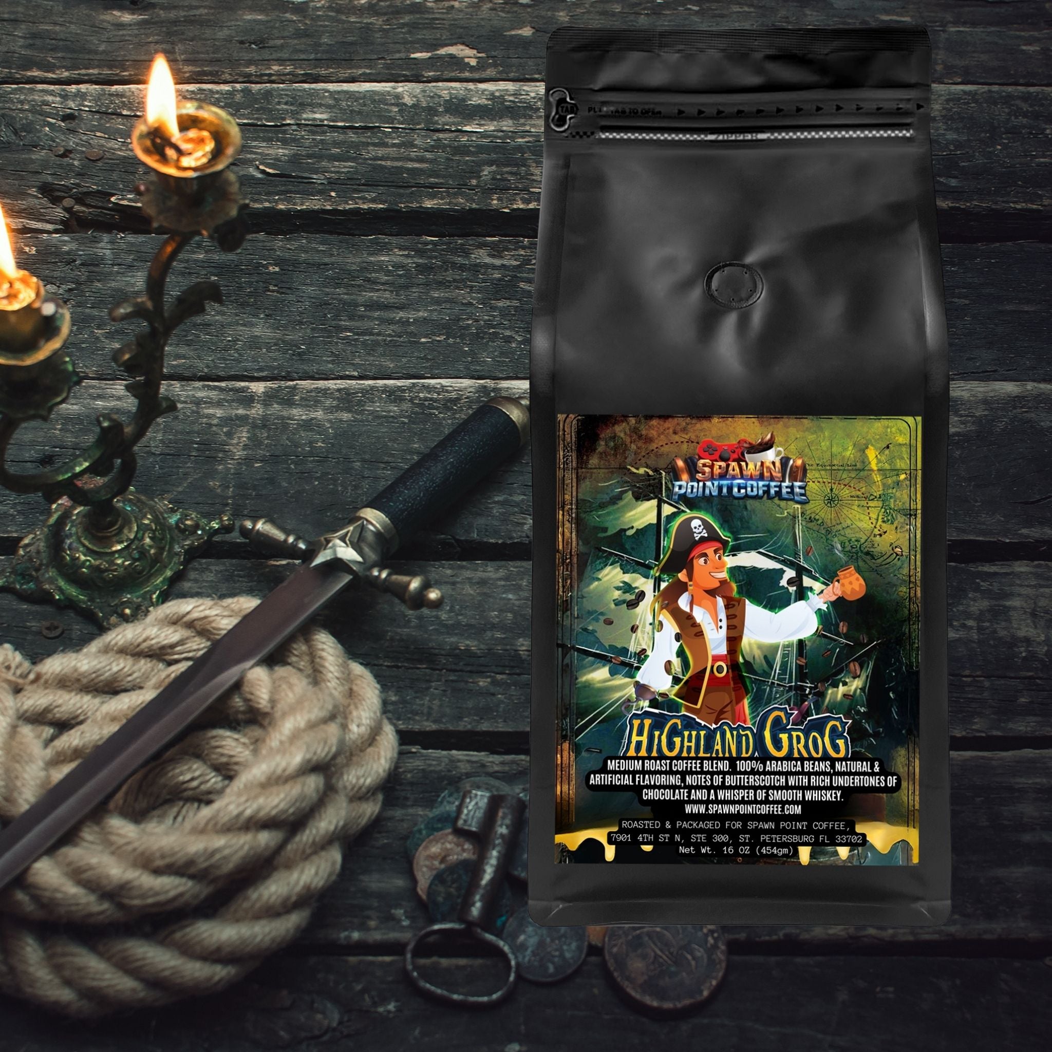 Your morning cup o' joe has never been so disarming and delightful. With the rustic flavor of our Highland Grog, gamers and coffee lovers alike can transport to an era of tumultuous battles and scurvy pirates with each sip. Not sure if ye be brave enough to try this treasure-trove of delightful flavors? Pour yourself a cup—or pour a swig or two into any world you can imagine—and your cup shall soon be emptied! Yo ho ho, get yer caffeine boost to go across the seven seas!