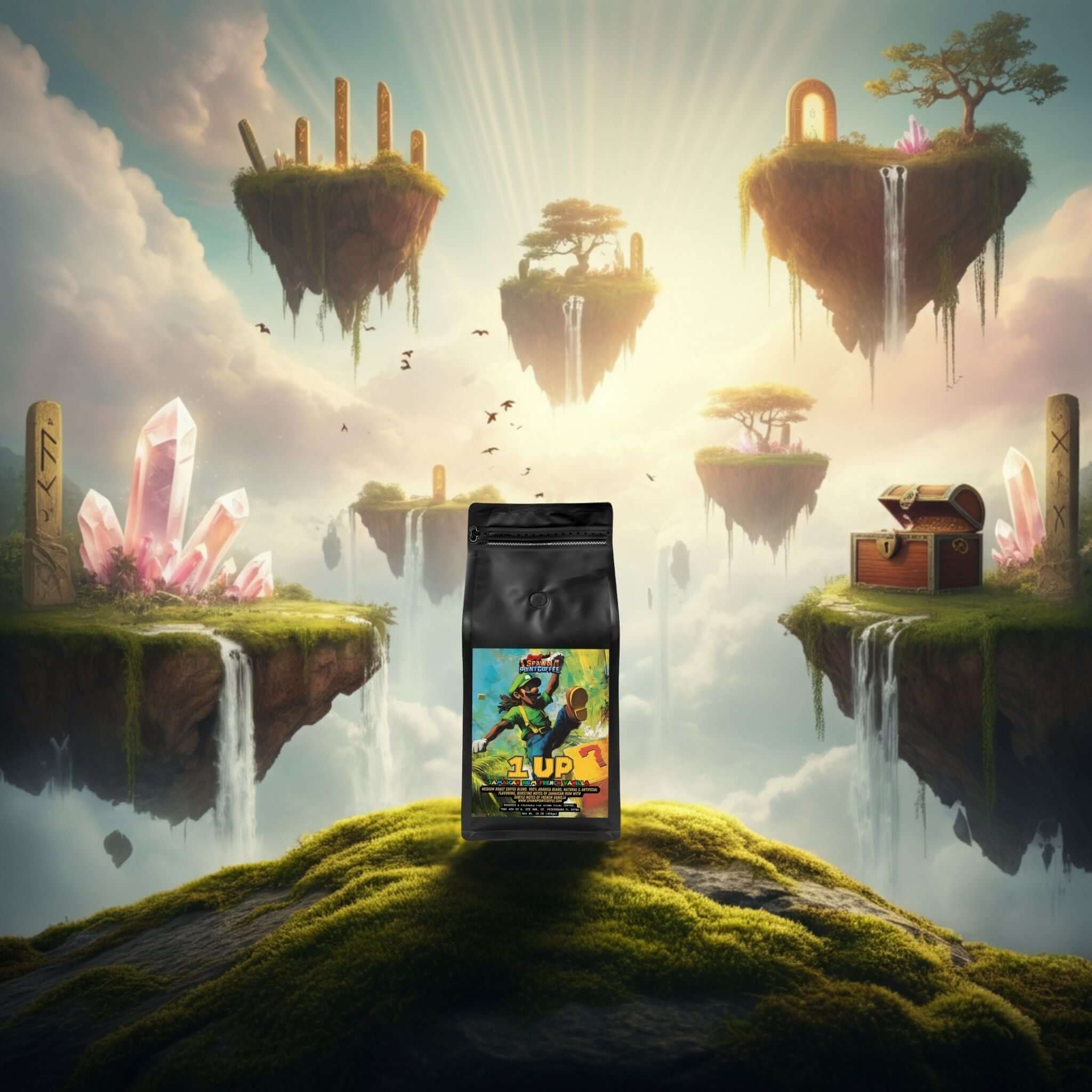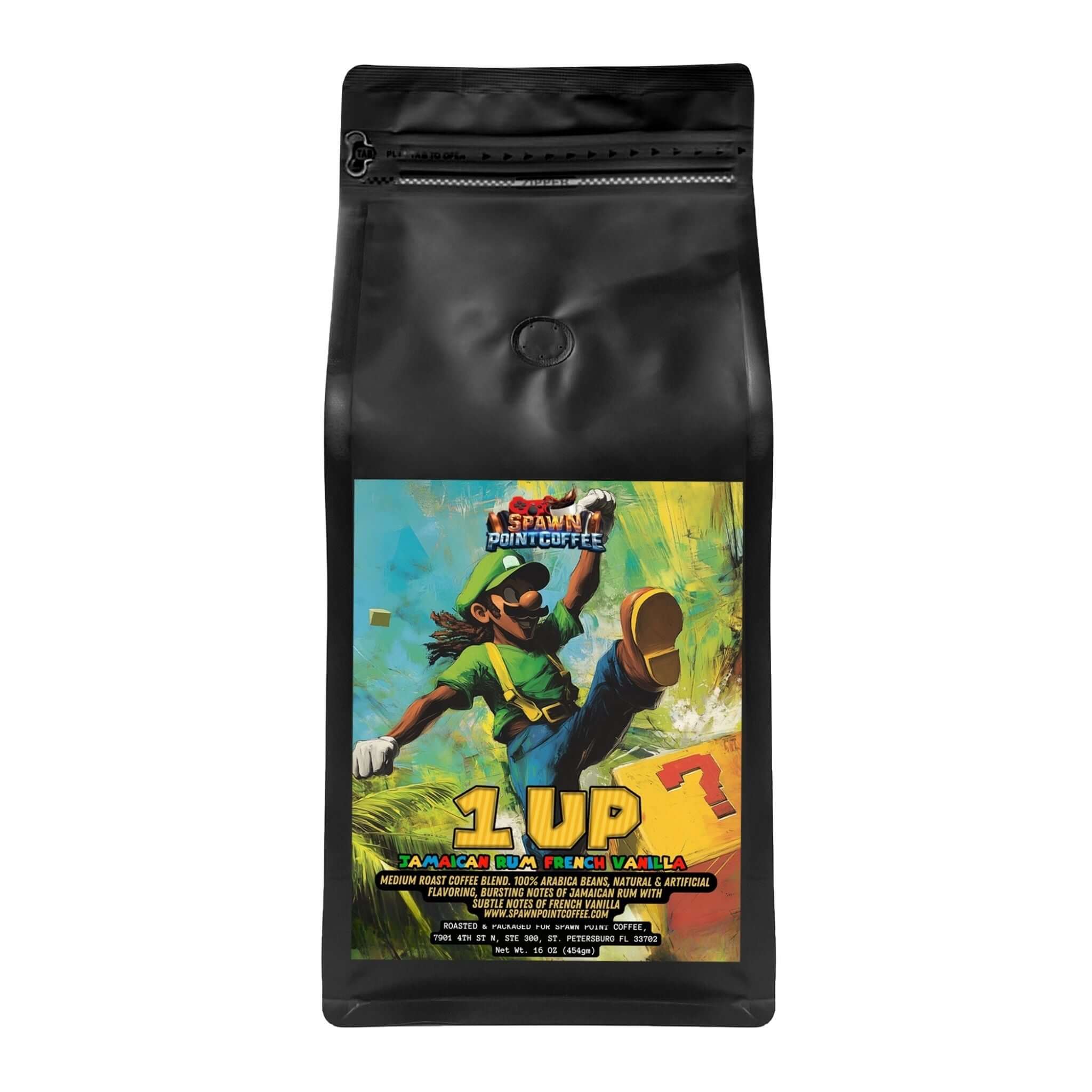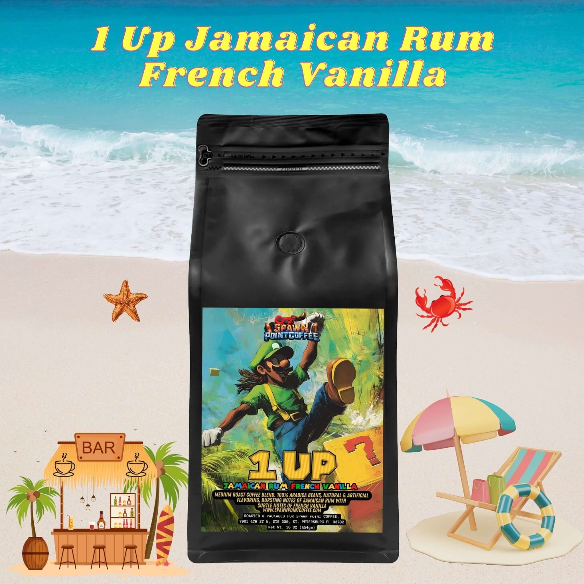 Imagine Luigi stepping off the plane in Jamaica, trading his green cap for a straw hat, and discovering the ultimate vacation power-up—a rich, aromatic coffee infused with bold Jamaican rum and sweet French vanilla. Now you can bring that island vibe straight to your gaming setup with 1 Up Jamaican Rum French Vanilla Coffee.